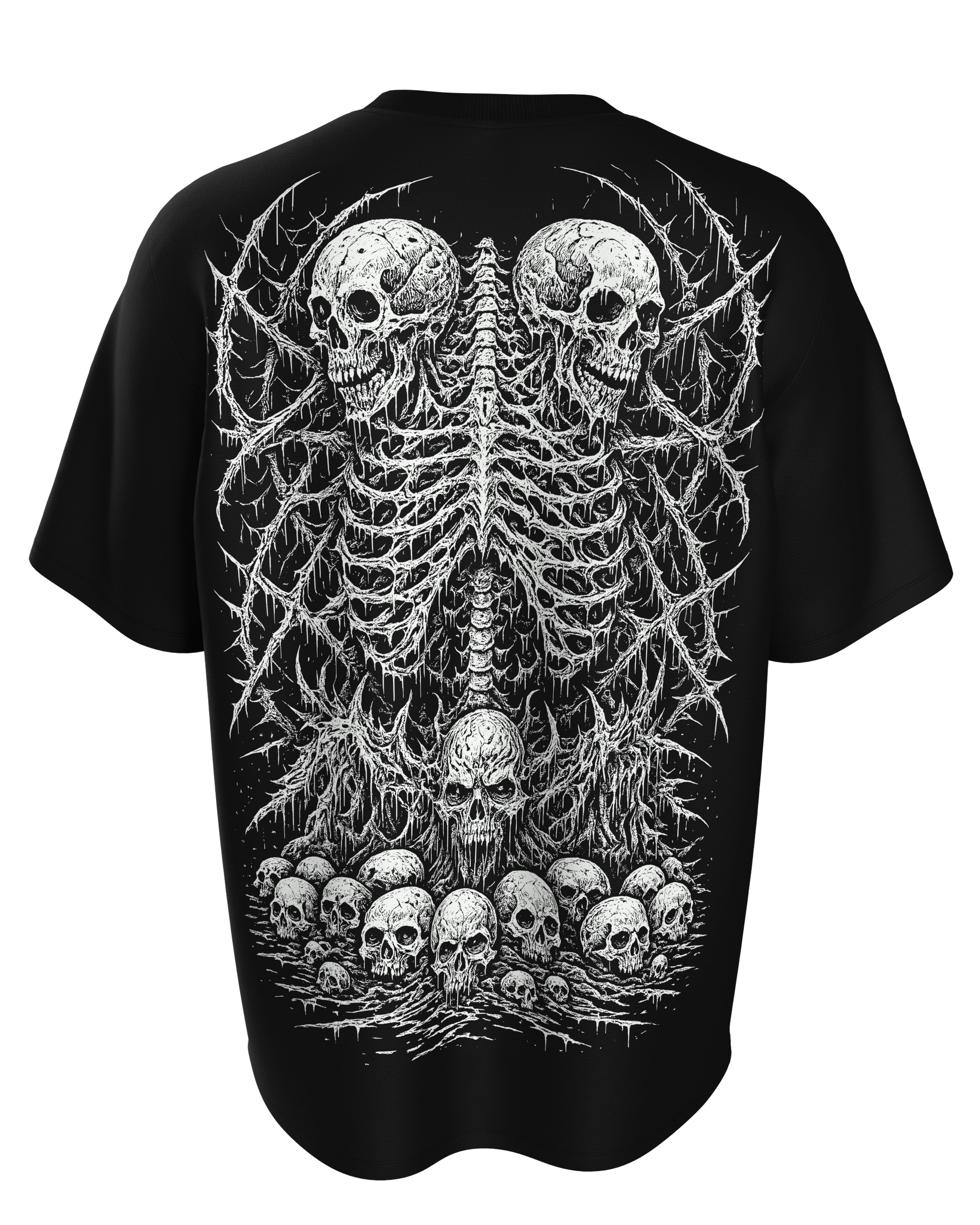 VRT-001 Koleksiyonundan Sanctum Mortem çöküşten sonra kalan en sade gerçekliktir. İki bedende birleşen gövde, aşağıda yığılan sessizlikle tamamlanır. Her çizgi, karanlıkta şekillenmiş bir lanettir. Bu tasarım, karanlığın izini yüzünde taşıyanlar için üretildi.